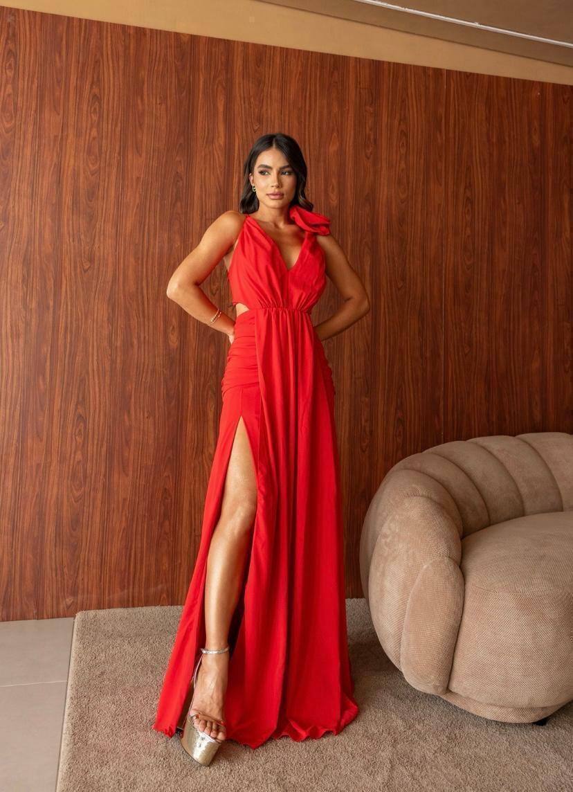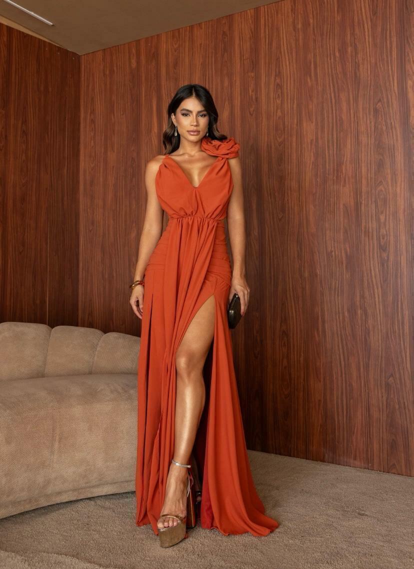 Tecido Daiquiri com forro , alças finas regulaveis , fechamento com botões nas costas , possui bojo com detalhe em flor no ombro , fluido , ziper e drapeado na parte do bumbum , possui fenda na parte frontal , forrado .