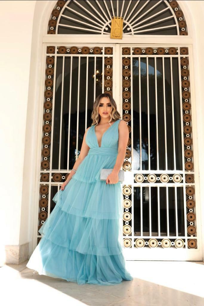 Tecido em Tule Forrado , COM BRILHO , alças grossas , leve transparecia em lateral do busto , fluido possui bojo , não possui fenda , detalhe em camadas 3 marias , decote em V com tule em busto , possui ziper na parte traseira .
