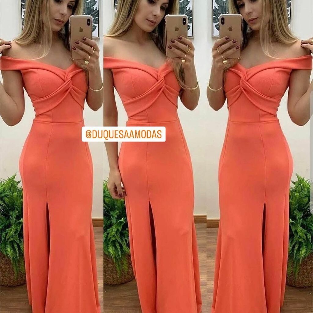 Tecido em Malha Crepe , modelo ombro a ombro , decote em V , detalhe cruzado em busto , bojos dando sustentação ao busto , possui fenda frontal , modelagem justa e acenturada ao corpo , vestindo tamanho único 38/42 .
