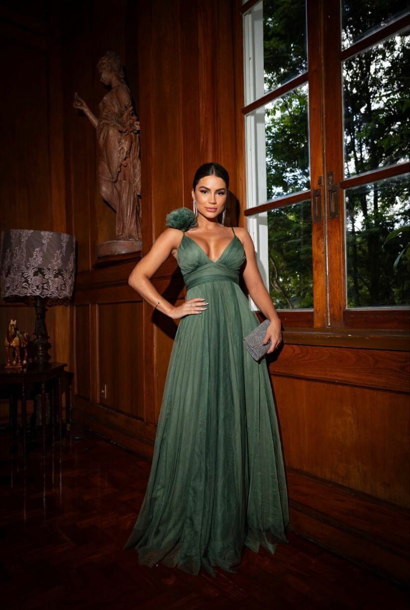 Tecido em Tule Forrado COM BRILHO , possui bojo dando sustentabilidade ao busto alças reguláveis sendo uma com detalhe em flor , com detalhe drapeados em cintura , decote em V , ziper traseiro , não possui fenda , fluido , vestido esbanjando puro charme e elegancia .