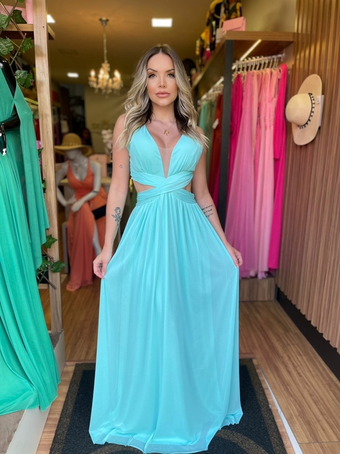 Tecido em Tule forrado , com detalhes cruzados em cintura dando acenturamento a silhueta, alças não regulaveis , detalhe em tule no busto com decote em V , amarraçao nas costas , possui bojo dando sutentação ao busto , modelagem fluida , não possui fenda , forro duplo SEM TRANSPARENCIAS .