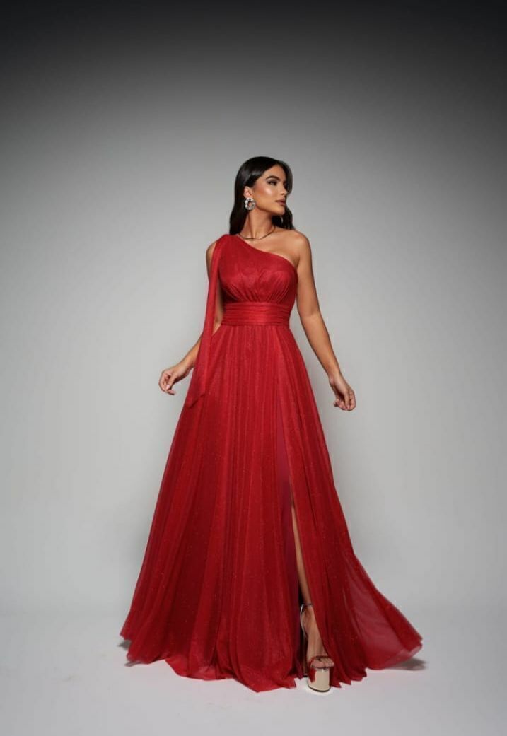 Tecido em Tule Forrado COM BRIHO , manga única , com detalhe em drapeados em busto e cintura , possui bojo em alta sustentabilidade de bustao , ziper lateral , fluido , possui fenda frontal , dress em puro charme e elegancia .