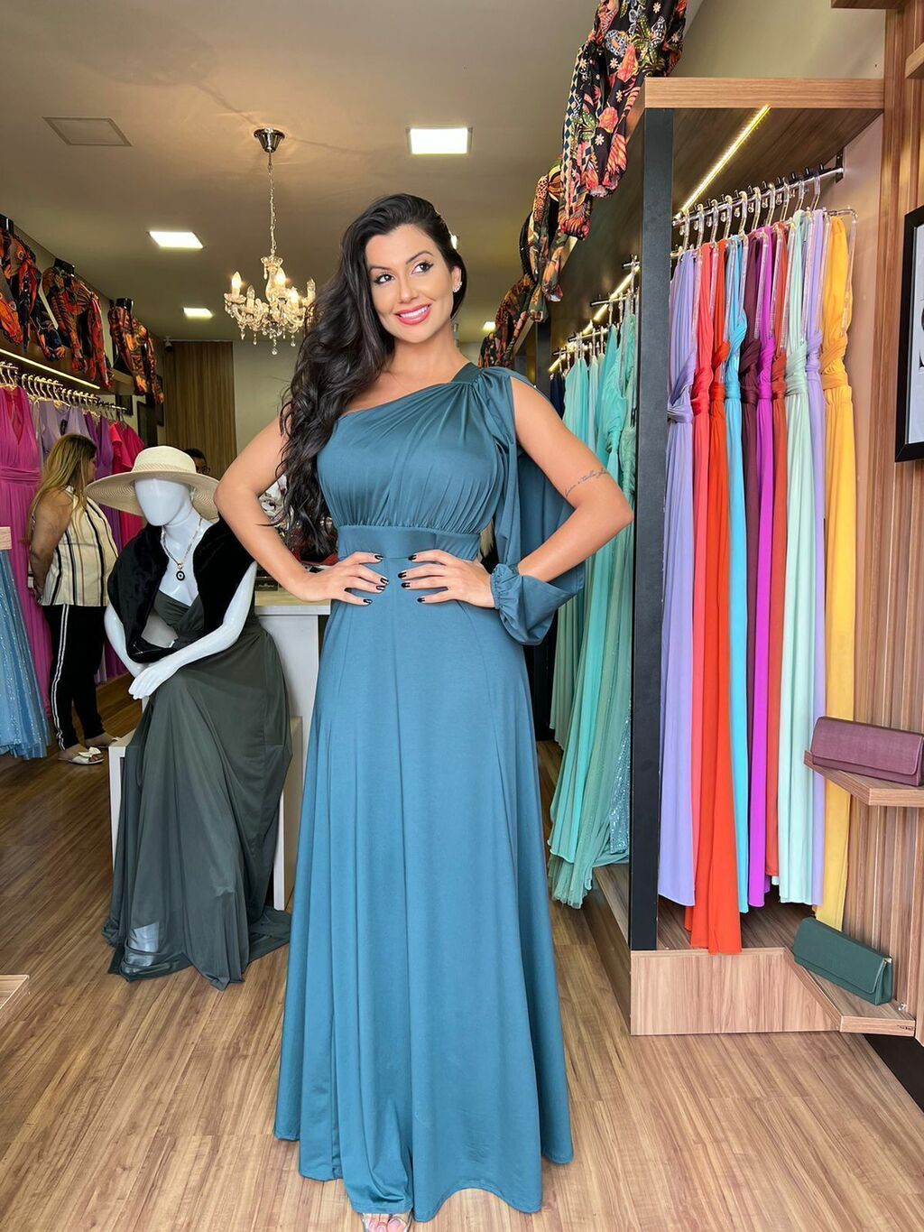 Tecido em Malha Fluity , manga única com elastico em punhos , decote em V , detalhe em abertura em manga única , possui bojos dando sustentação ao busto , não possui fenda , forrado ate a medida do joelho sem transparencias , modelagem acenturada justa ao corpo , vestindo tamanho único .