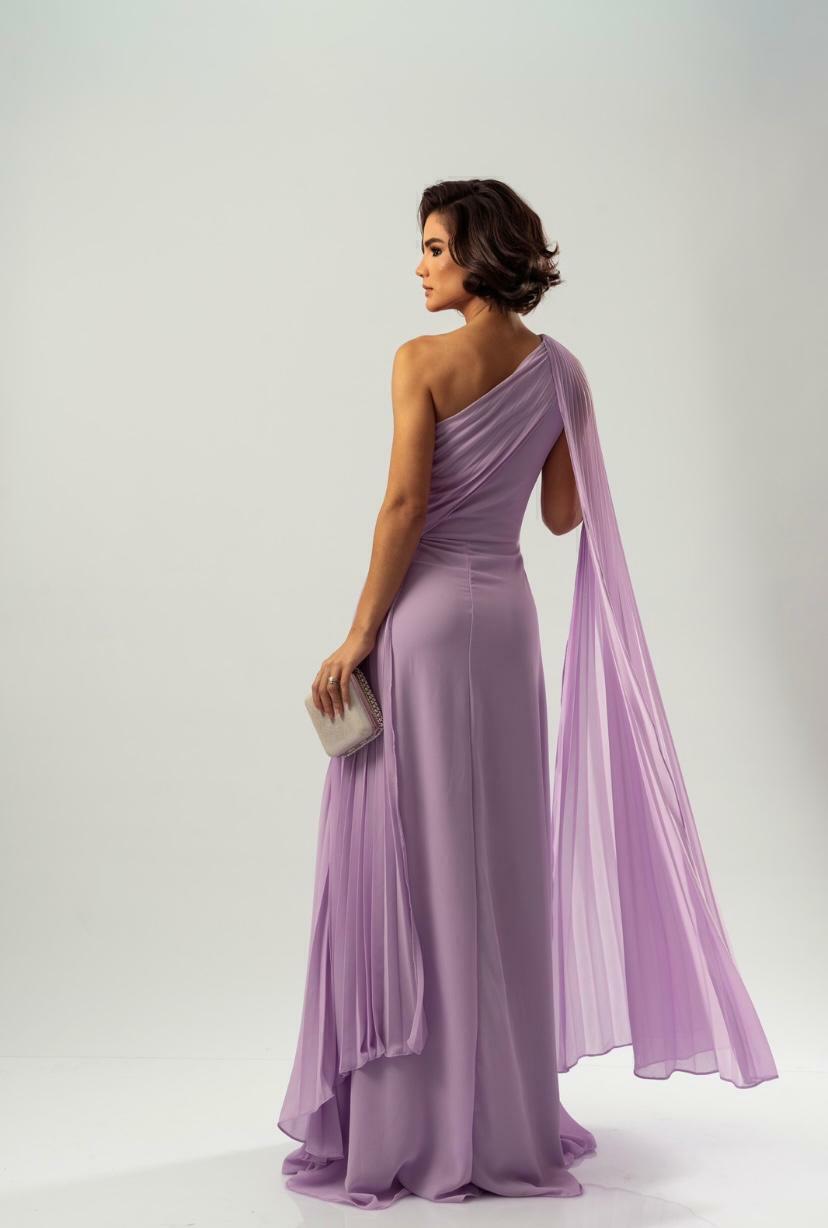 Tecido em Musseline , ombro único em efeito capa , fluido com fenda e detalhe frontal , possui bojo dando sustentabilidade ao busto , ziper lateral , modelagem fluida .