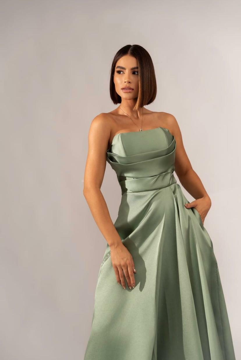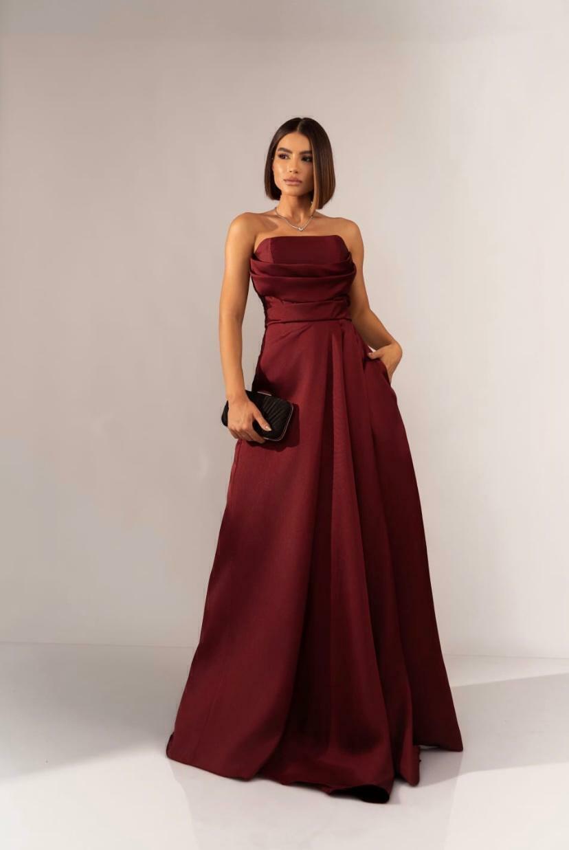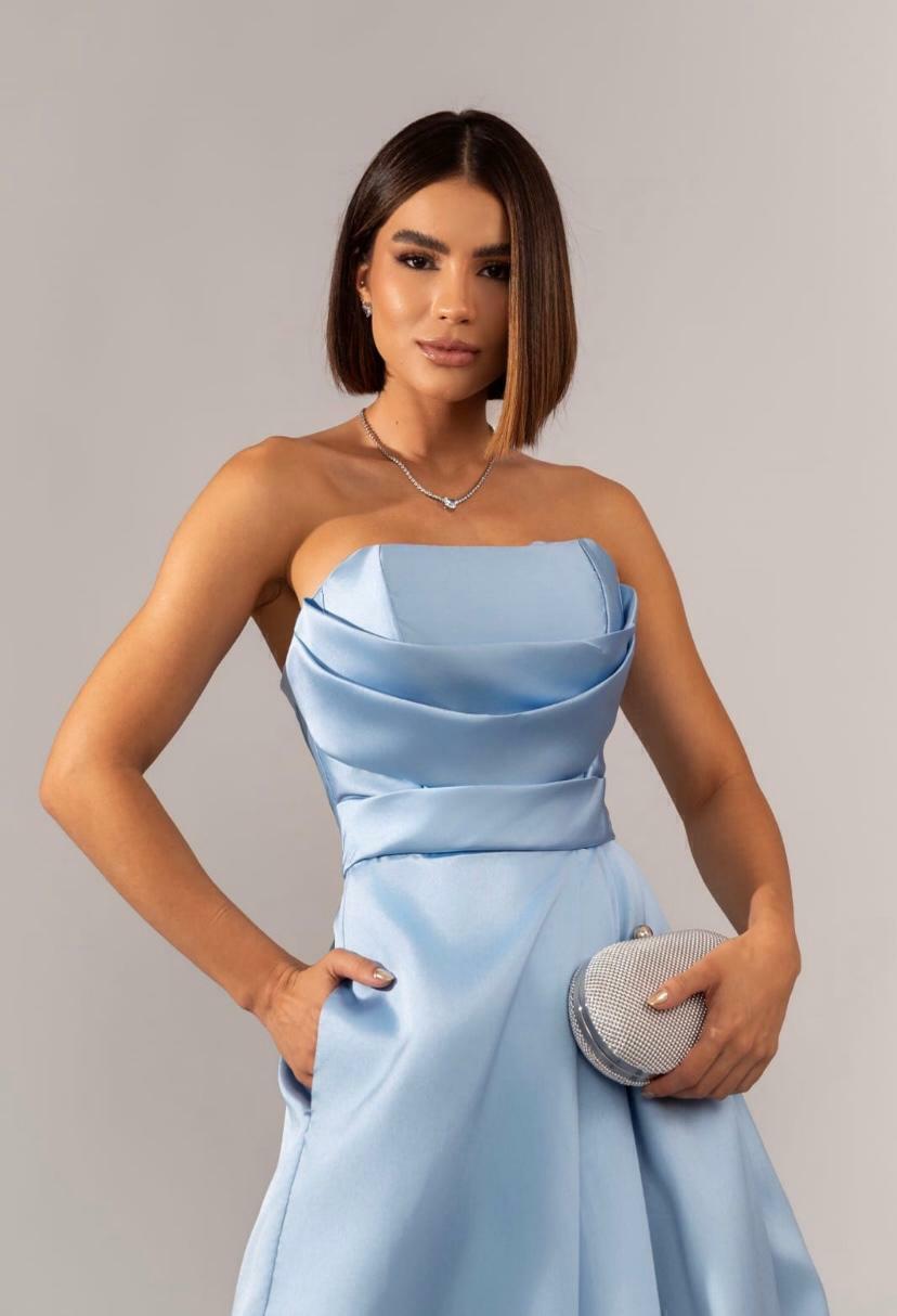 Tecido em Alfaiataria , tomara que caia com detalhe em drapeado em busto , fenda frontal , possui bojo dando sustentação em busto , ziper traseiro , dress em puro charme e elegancia .